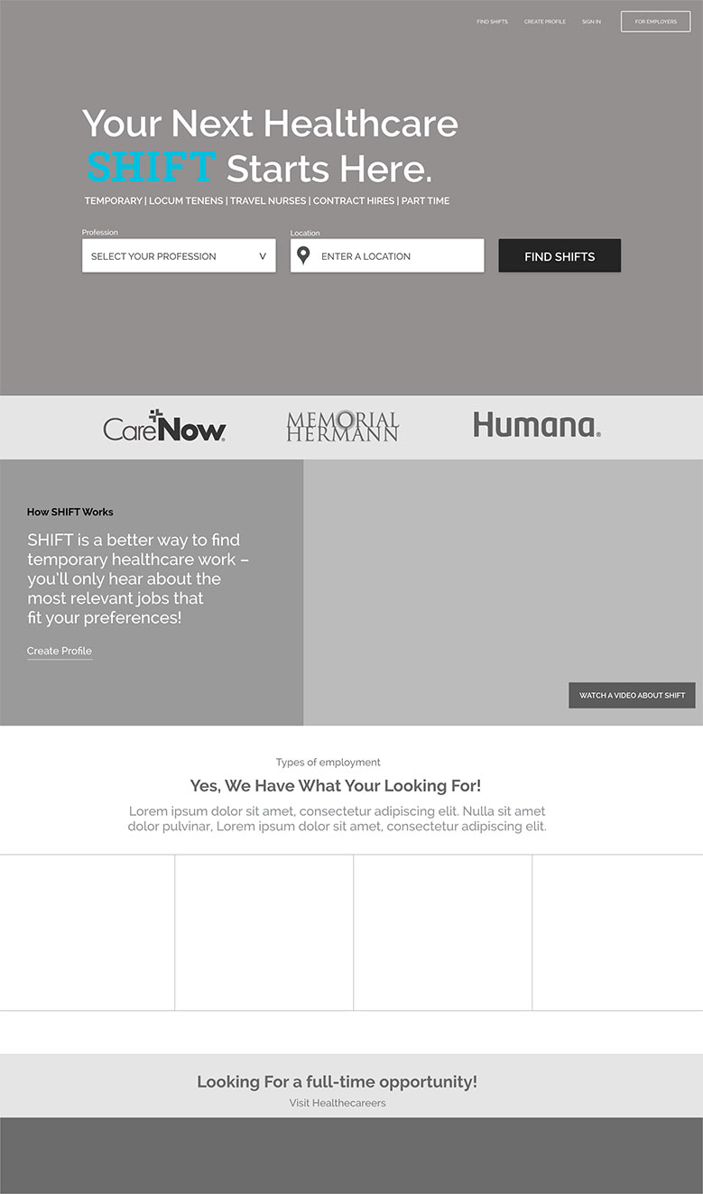 Shift is another product of Health eCareers that my team supported with our design services. I personally wireframed and designed the home page and the production team coded it. The concept behind the design was a clean and fresh look while targeting a younger demographic.